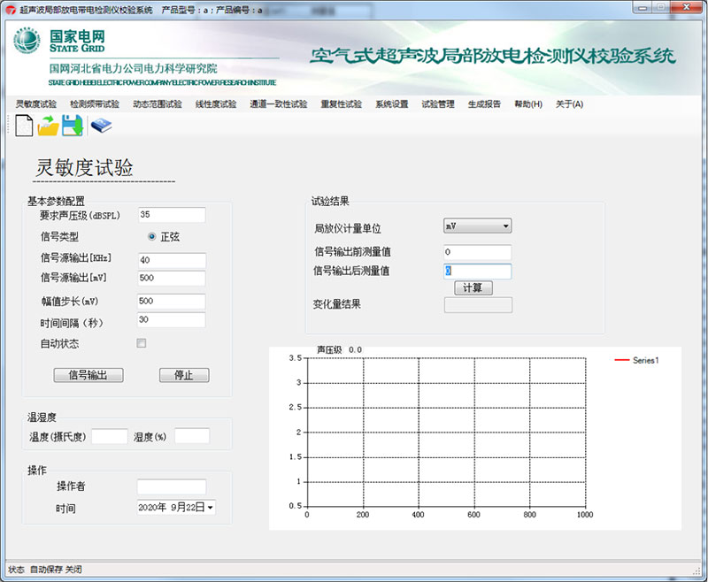 非接觸式超聲波局部放電檢測(cè)儀校驗(yàn)系統(tǒng)的智能測(cè)控軟件能夠?qū)崿F(xiàn)一鍵自動(dòng)完成電壓調(diào)節(jié)、頻率調(diào)節(jié)、聲壓計(jì)自動(dòng)設(shè)置等功能,軟件界面如下: