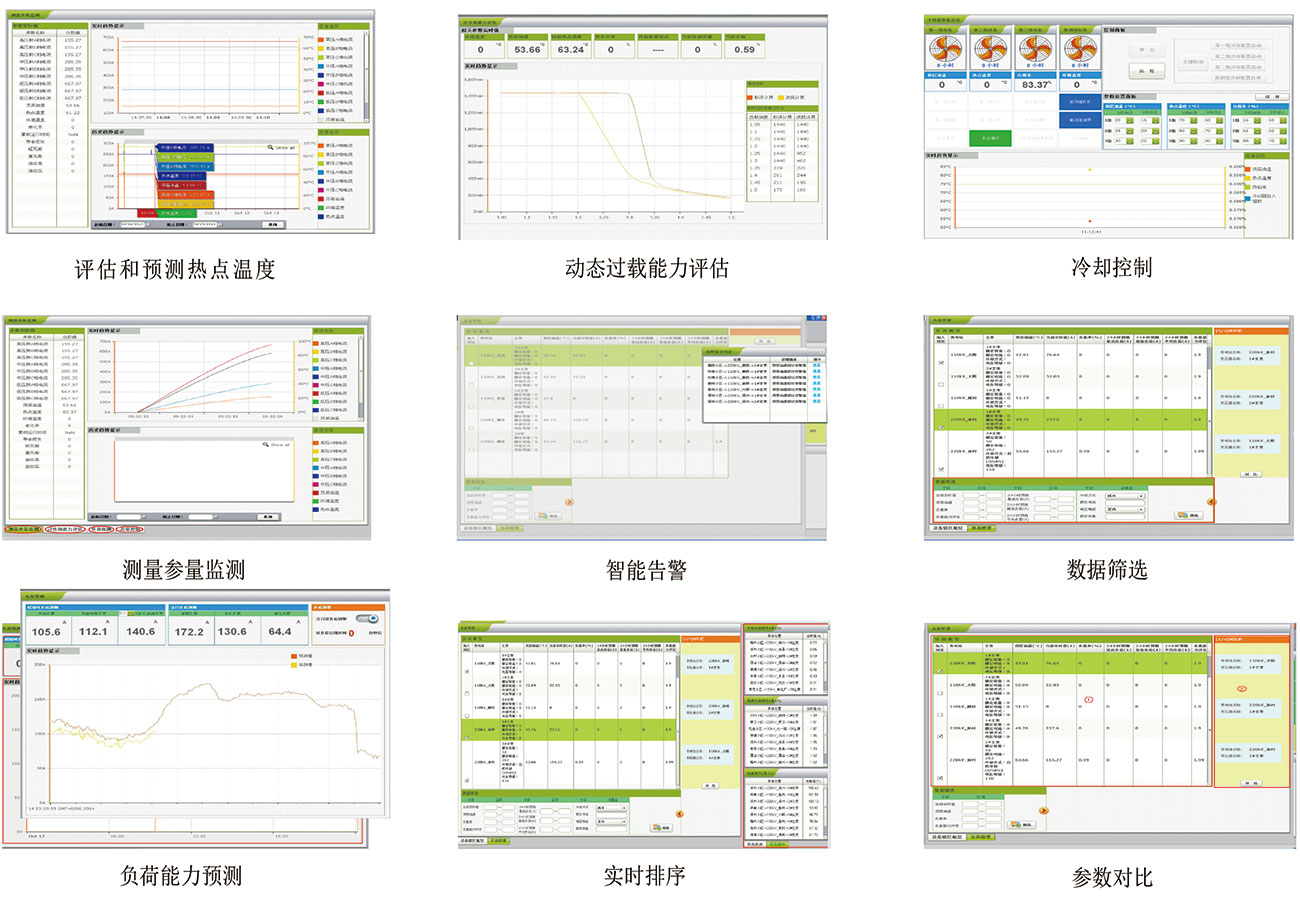 1、評估和預(yù)測熱點(diǎn)溫度。根據(jù)負(fù)荷電流、頂層油溫、環(huán)境溫度等在線監(jiān)測數(shù)據(jù),結(jié)合變壓器基本參數(shù)(容量、電壓電流、類型、冷卻方式等)和試驗(yàn)數(shù)據(jù),實(shí)現(xiàn)動態(tài)評估和預(yù)測繞組的熱點(diǎn)溫度。